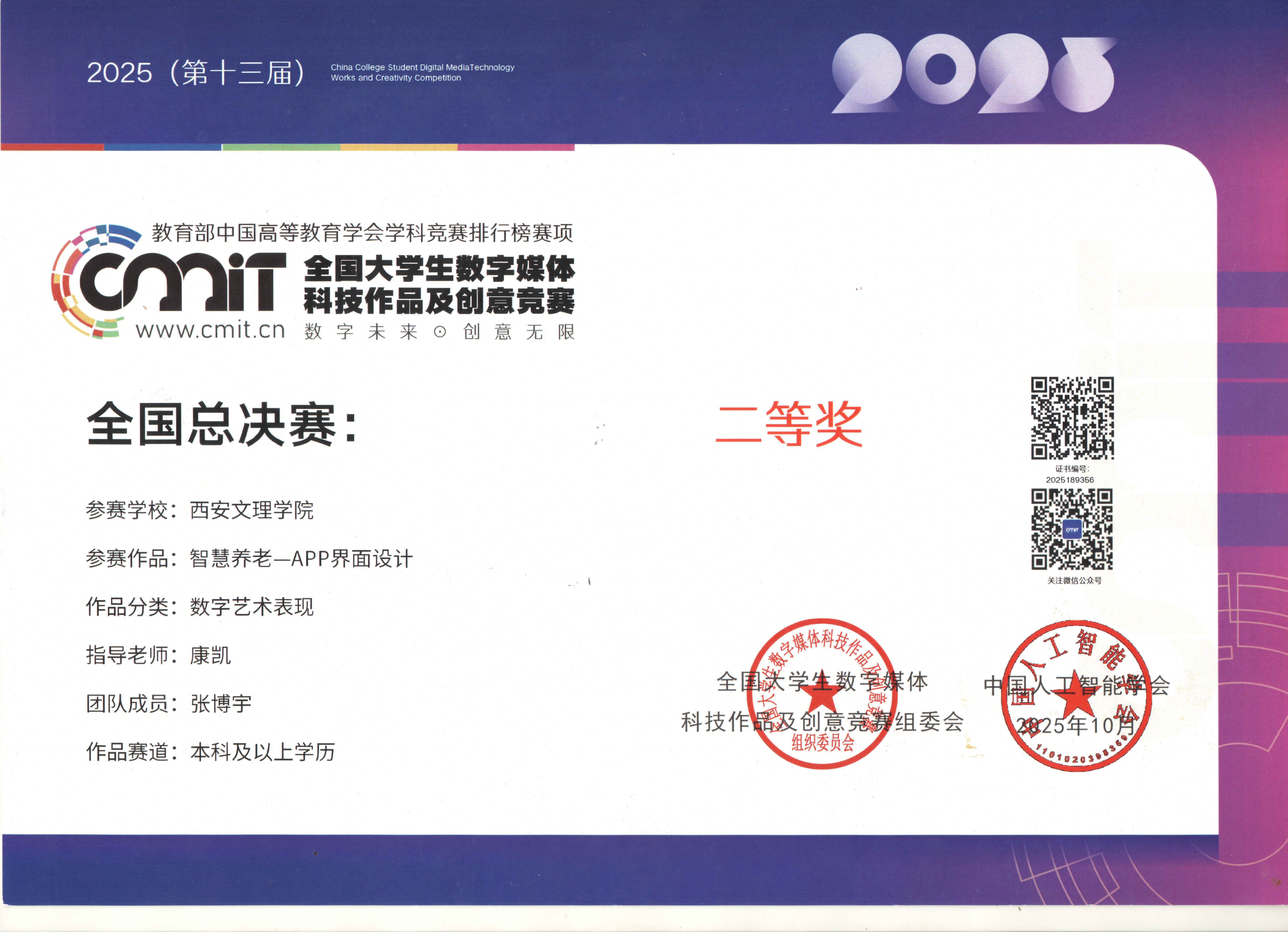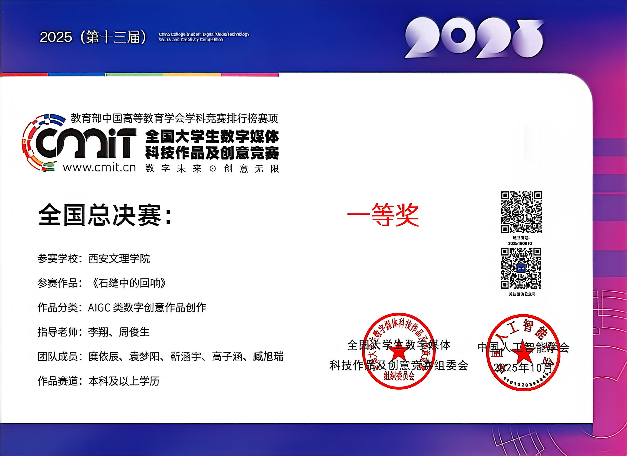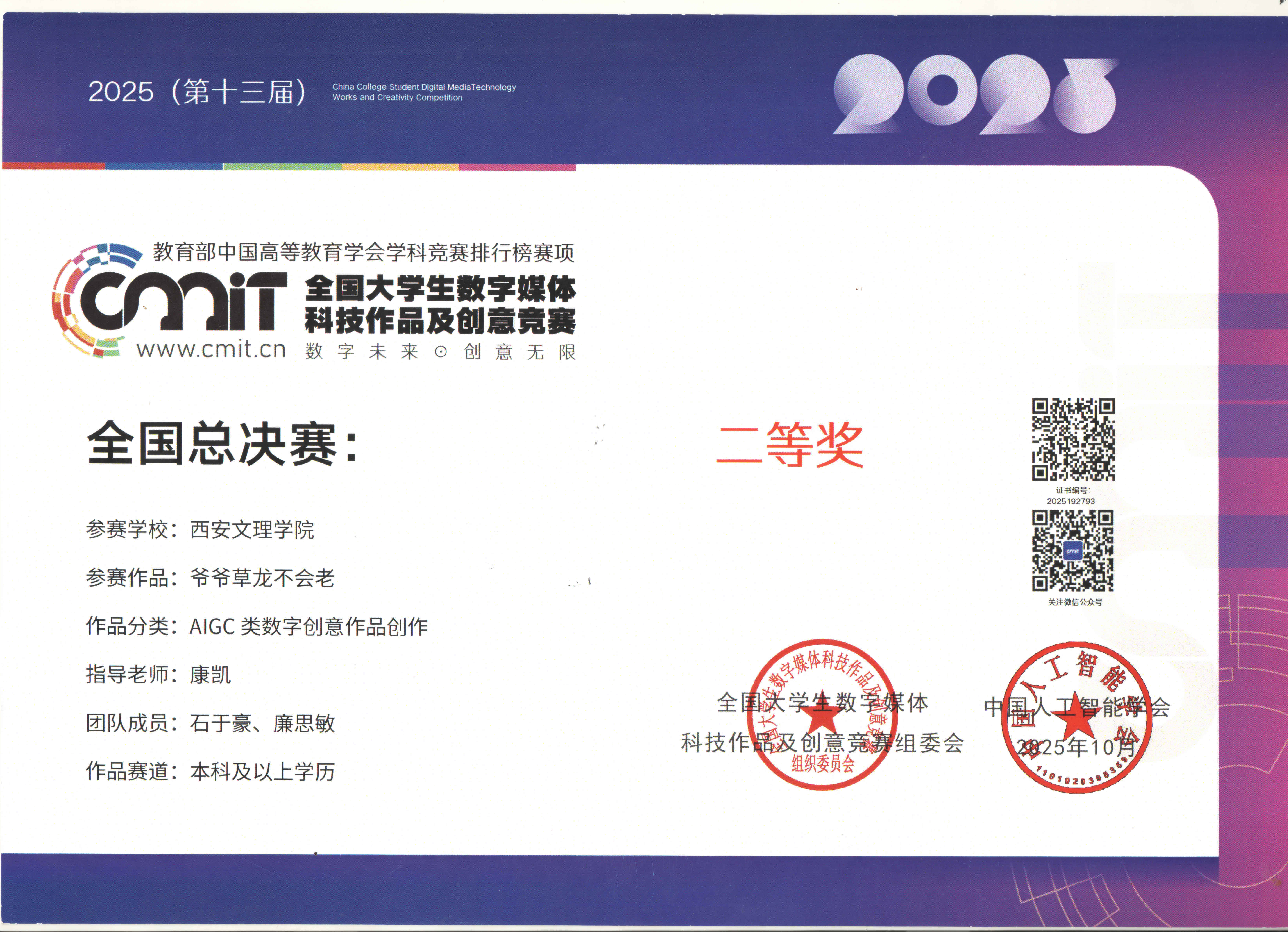 此次全国大学生数字媒体科技作品及创意竞赛是在全面贯彻落实党的二十大精神、推进“教育强国、科技强国、人才强国”战略背景下举办的全国性高水平学科竞赛,吸引了全国众多高校师生的积极参与。tyc1286太阳成集团获奖师生立足自身学科特色,将教师科研项目、教改与专业教学深度融合,通过创新实践教学将地域文化与专业知识深度融合:依托“走读秦岭”项目,以数字技术创新展现本土文化魅力;结合省级创新创业在线开放课程《产品开发设计》钻研陕西地域优秀传统文化元素,运用动态影像、AIGC等手法实现文化表达的当代转化;基于“AIGC与非遗传承”等研究方向,引导学生关注社会现实问题,运用数字艺术语言传递人文关怀。参赛作品既展现了我们学子扎实的专业能力,也体现了“以创促学、以美育人”的教学理念。